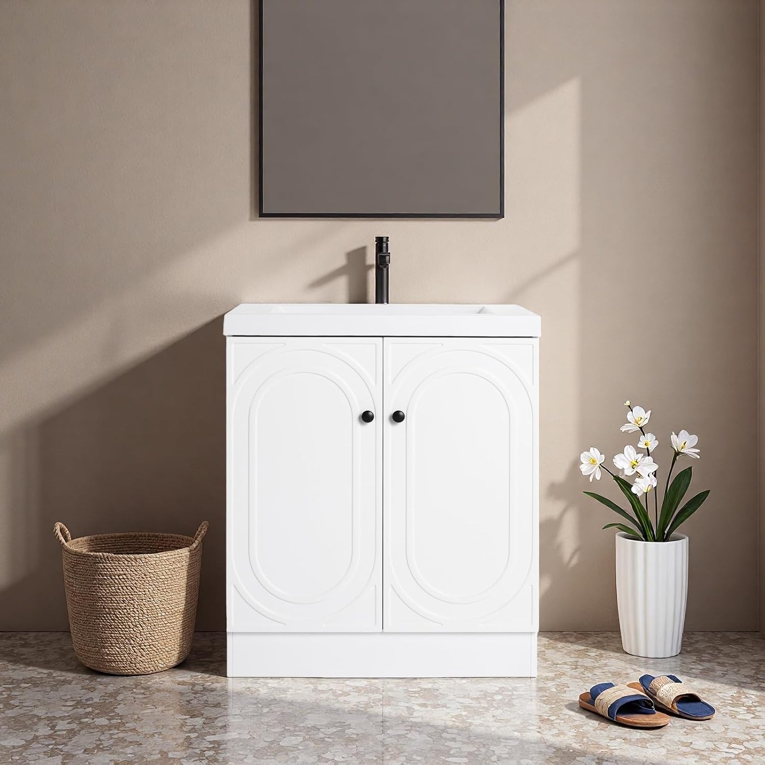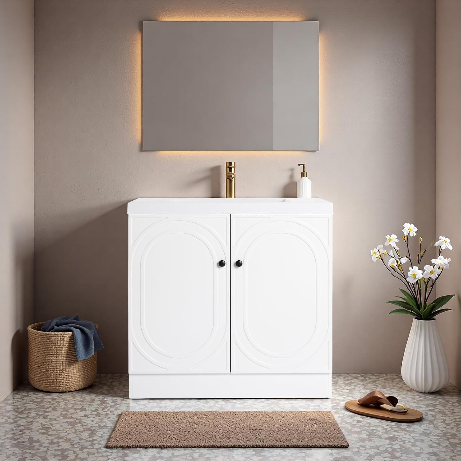 Trygoal 36" Bathroom Vanity with Sink, Freestanding Bathroom Storage Cabinet with Resin Sink & 2 Soft-Close Cabinet Doors, Modern Compact Vanity with Adjustable Shelf & 3-Color Handles, White