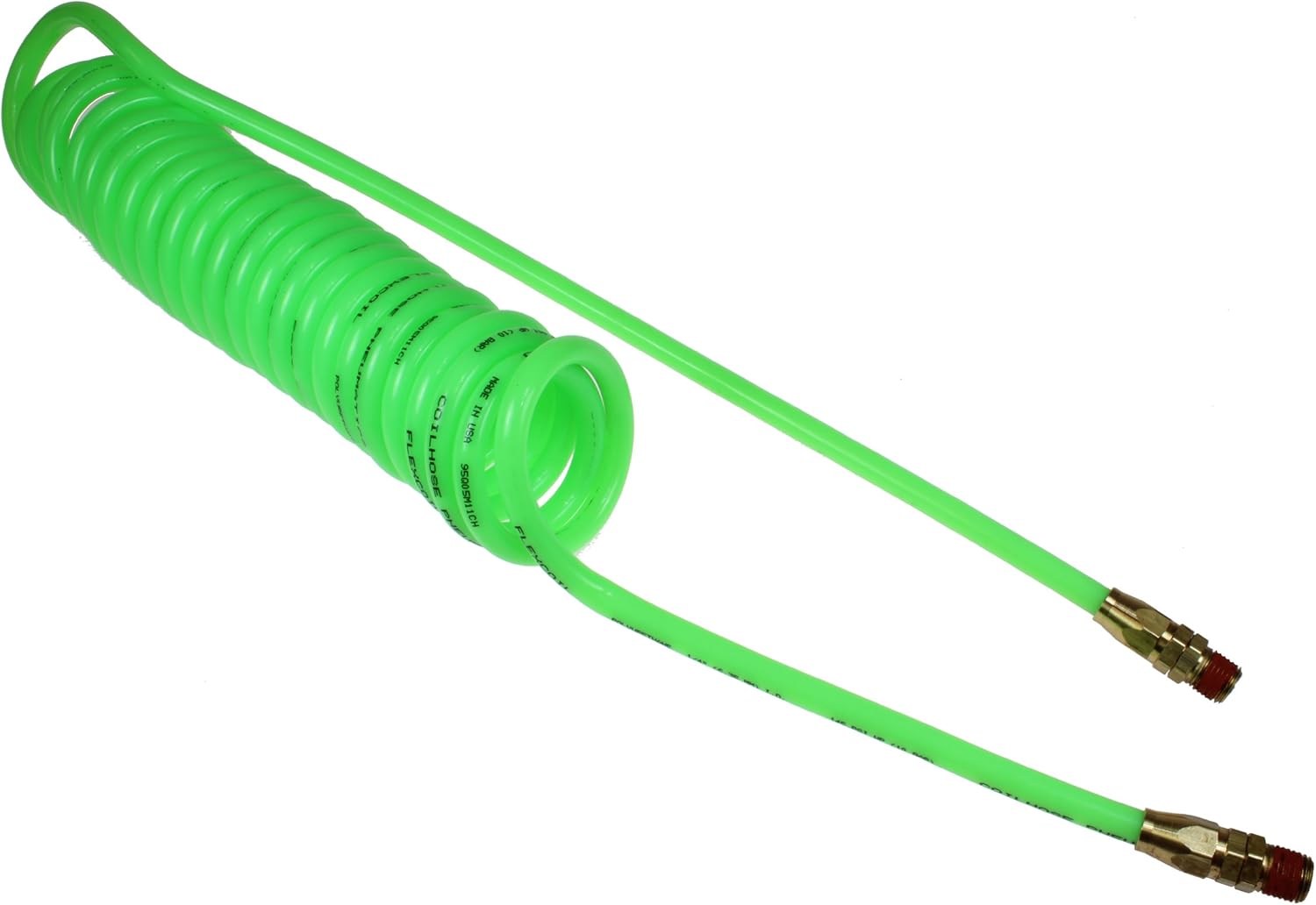 Flexcoil (Polyurethane Self-Storing Air Hose) was developed to eliminate the two most common limitations of other self-storing hoses, kinking and abrasion resistance. This lightweight, yet extremely durable hose, will withstand the rigors of tough industrial environments while maintaining its resiliency over a long period of time. Supplied with brass reusable MPT fittings and integral vinyl strain relief sleeves.