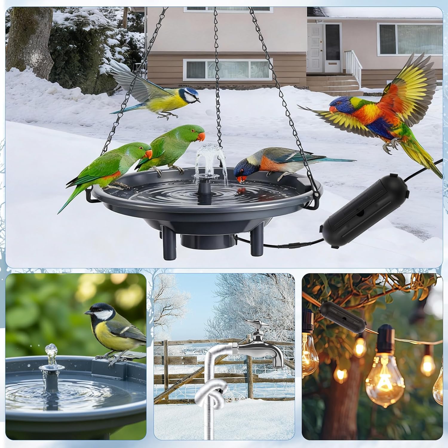 Features: Our hanging bird baths offering flowing water, providing a warm bird habitat for birds to drink and bathe. All elements are fully enclosed and sealed, so you don't have to worry about your backyard birds and animals getting hurt by pecking at the cables. Specifications: Material: plastic Color: black Size: 12 Inch Hanging bird bath 32.8 ft Pipe insulation tape wrap 8 Inch Extension cord cover Package includes: 1 x Hanging bird bath 1 x Pipe Insulation tape wrap 1 x Extension cord cover Notes: Manual measurement, please allow slight errors on size. The color may exist a slight difference due to different screen displays.