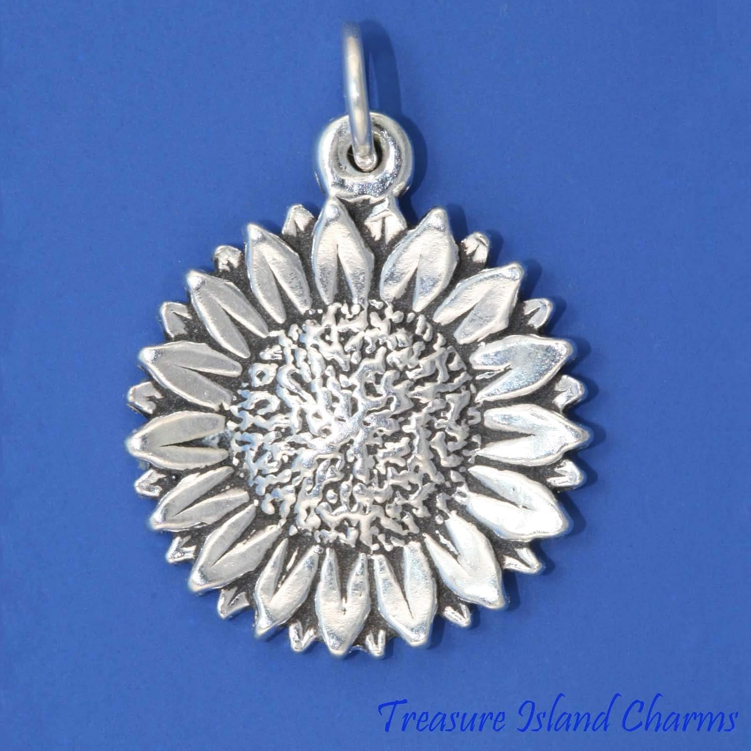 Sunflower .925 solid sterling silver charm or pendant. The charm is hallmarked, comes with a 6mm sterling silver keychain/split ring, and can fit a traditional charm bracelet or a chain necklace.